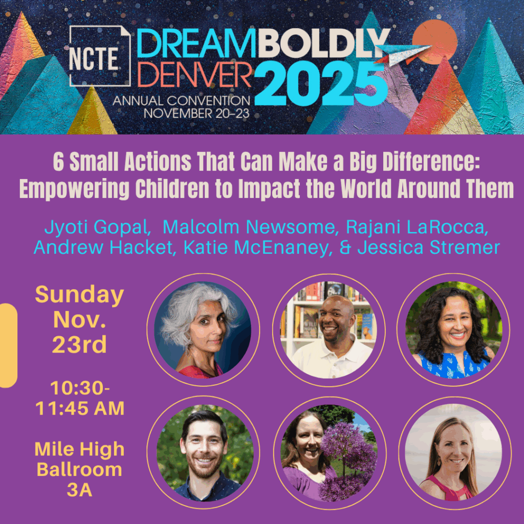 Our Sunday panel, 6 Small Actions That Can Make a Big Difference: Empowering Children to Impact the World Around Them, included authors Jyoti Gopal, Malcolm Newsome, Rajani LaRocca, Andrew Hacket, and Jessica Stremer. We will be sharing resources and recommendations below.